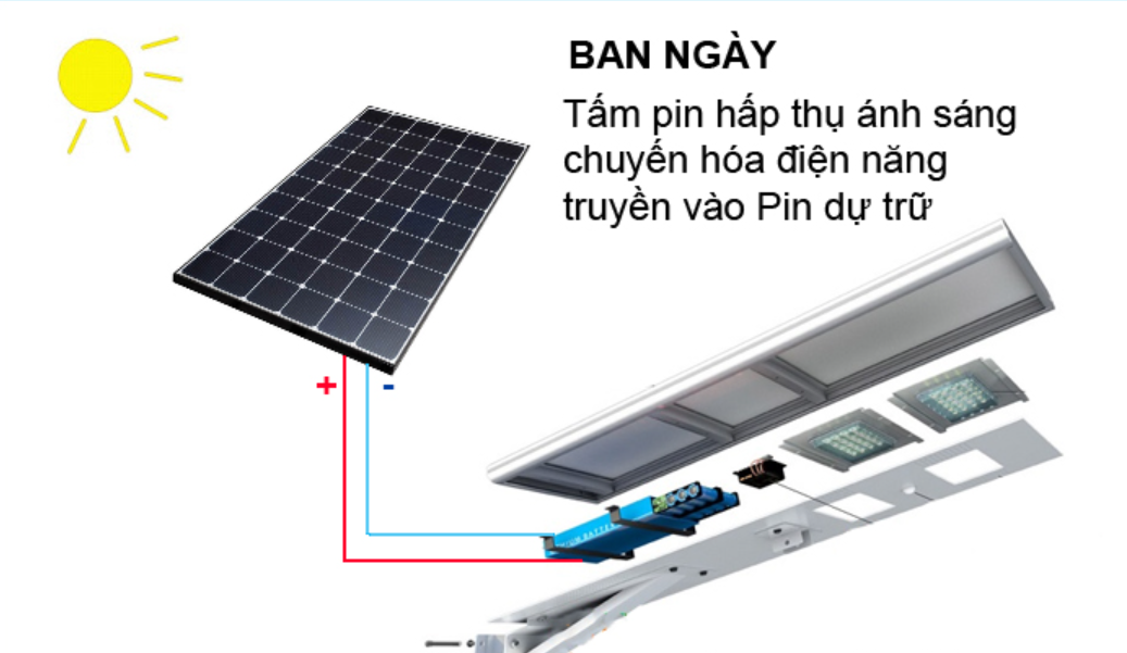 Pin sạc: Hay còn gọi là pin lưu trữ, với khả năng dự trữ nguồn năng lượng sau khi tấm pin hấp thu và chuyển hoá thành điện năng. Các mẫu đèn khác nhau sẽ có các dung lượng pin khác nhau. Dung lượng pin lưu trữ càng lớn, càng tích được nhiều điện, đảm bảo chiếu sáng ổn định trong thời gian dài, cả khi trời âm u, mây mù.