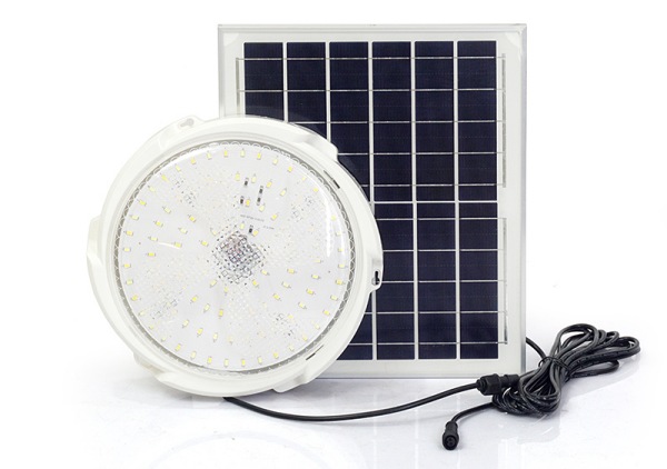 Cấu tạo đèn gồm 2 bộ phận chính: Đèn ốp trần (bóng LED + mạch điều khiển + Pin trữ điện) và tấm panel năng lượng mặt trời loại Polycrystal 6V/20W.