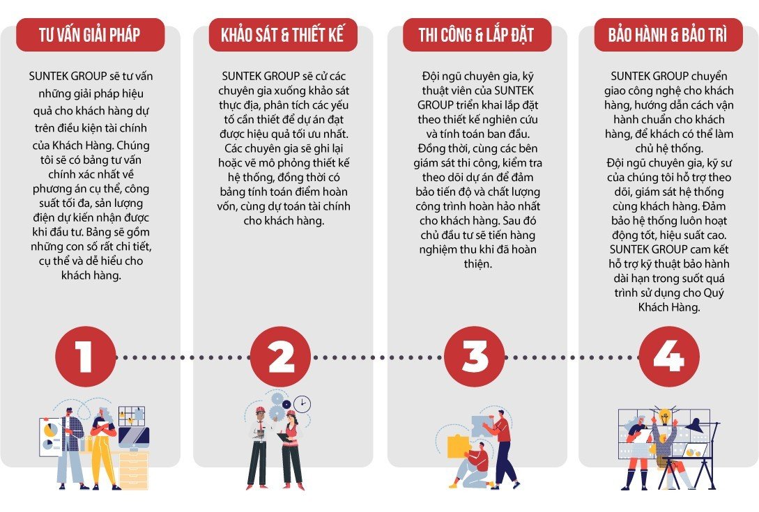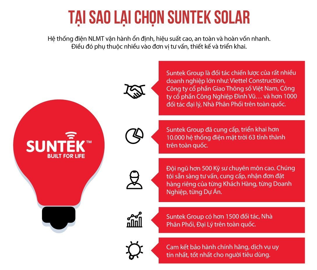 Suntek Group mang đến cho Quý Khách Hàng những dịch vụ hoàn hảo nhất, trọn gói từ tư vấn, khảo sát, thiết kế, vận hành, bảo trì – bảo hành. Cam kết hệ thống đạt hiệu suất, chất lượng cao nhất. Chính vì vậy, đầu tư các công trình Năng Lượng Mặt trời.
